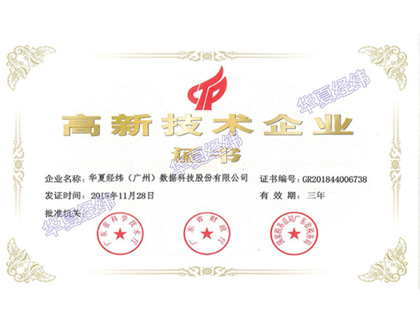 2018年12月16日,華夏經緯(廣州)數據科技股份有限公司通過了由廣東省科技廳、廣東省財政廳、國家稅務總局廣東省稅務局組織的國家高新技術企業認定,并榮獲國家“高新技術企業”稱號,由此正式邁入國家高新技術企業行列。