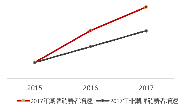 (3)2017年起,潮牌服裝市場規(guī)模增長迅速,潮牌消費(fèi)增速是非潮牌的3.7倍。增長速度達(dá)到62%,而非潮牌消費(fèi)增速是17%。潮牌的消費(fèi)者數(shù)量增幅完勝非潮牌。