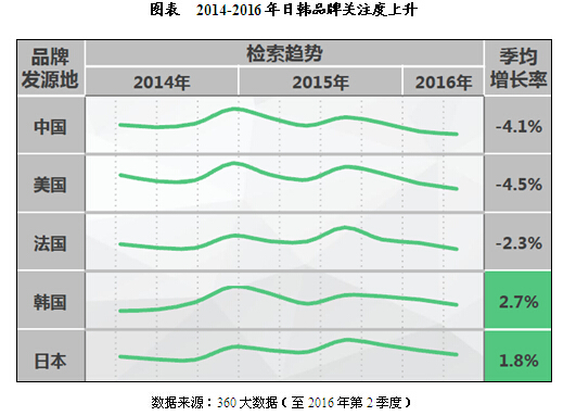 此外,從發(fā)展趨勢(shì)看,2014-2016年,日韓品牌的關(guān)注度增速最快。