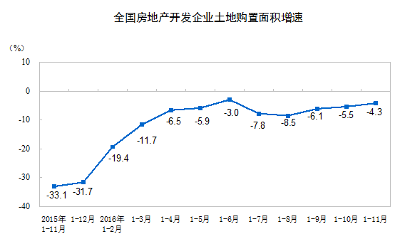 1-11月份,房地產開發企業土地購置面積19046萬平方米,同比下降4.3%,降幅比1-10月份收窄1.2個百分點;土地成交價款7777億元,增長21.4%,增速提高4.7個百分點。