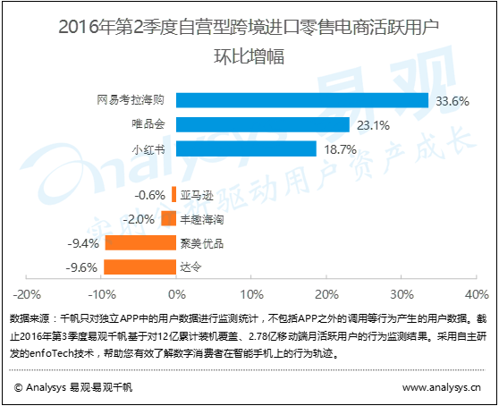 自營型跨境進(jìn)口零售電商中,承載其業(yè)務(wù)APP的活躍用戶表現(xiàn)出了較明顯的差距:網(wǎng)易考拉海購以33.6%的增長態(tài)勢處于第一,其在郵箱、新聞、音樂、游戲等領(lǐng)域的用戶協(xié)同效應(yīng)逐漸被釋放出來。唯品會與小紅書差距不大,分列以23.1%和18.7%居于第二、第三位,其余的主要廠商,第2季度的活躍用戶環(huán)比都為負(fù)增長。