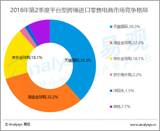 在平臺型跨境進(jìn)口零售電商中,阿里巴巴旗下的天貓國際、淘寶全球購居于領(lǐng)先地位,其份額分別達(dá)到了38.3%和32.2%,而京東全球購緊隨其后,擁有18.1%的份額;以上三個(gè)平臺占據(jù)了平臺型跨境進(jìn)口零售市場中近九成的份額,遙遙領(lǐng)先于其他廠商,在市場中有絕對的影響力。另外,蘇寧海外購、洋碼頭分別以2.2%和1.5%的份額排在第四、第五位,其還有進(jìn)一步擴(kuò)大市場份額的空間。