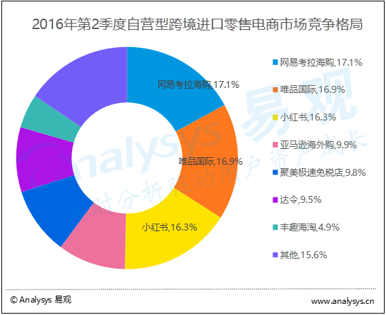 在自營型跨境進(jìn)口零售電商中,相對平臺型而言較為分散,各廠商的競爭更為激烈。網(wǎng)易考拉海購以17.1%的份額排在第一位,唯品國際與小紅書分別以16.9%和16.3%的份額排在第二、第三位。市場中前三位占據(jù)剛好過半的份額,處于第一梯隊(duì),相對于其他廠商而言,有較明顯的領(lǐng)先優(yōu)勢。亞馬遜海外購、聚美極速免稅店、達(dá)令的市場份額較為接近,處于第二梯隊(duì)。