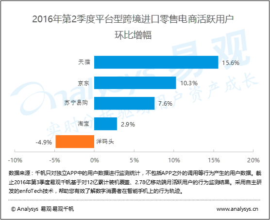 平臺型跨境進(jìn)口零售電商中,承載其業(yè)務(wù)APP的活躍用戶表現(xiàn)出了一定的差異:天貓和京東相對較高,分別為15.6%與10.3%;淘寶的活躍用戶增長較低,只有2.9%;蘇寧易購介于二者之間,為7.6%;而洋碼頭則出現(xiàn)了負(fù)增長,為-4.9%。這表現(xiàn)出了用戶的選擇偏好有朝B2C模式的平臺型電商集中的趨勢。