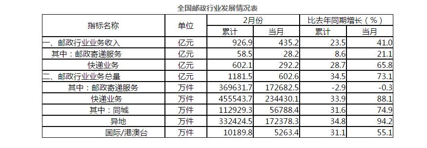 2月份,全行業業務收入完成435.2億元,同比增長41%;業務總量完成602.6億元,同比增長73.1%。