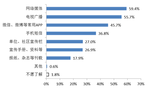 對(duì)于獲取生活垃圾分類相關(guān)知識(shí)的主要途徑,受訪居民選擇“網(wǎng)絡(luò)媒體”和“電視廣播”的比例最高,分別為59.4%、55.7%。此外,希望通過(guò)“微信、微博等常用APP”“手機(jī)短信”“單位、社區(qū)宣傳欄”和“宣傳手冊(cè)、資料”等途徑來(lái)了解垃圾分類知識(shí)的比例也較高(此題為多選,相加不等于100%,詳見(jiàn)圖4)。